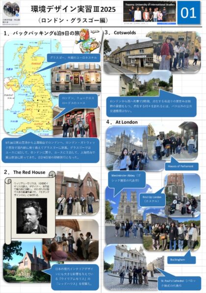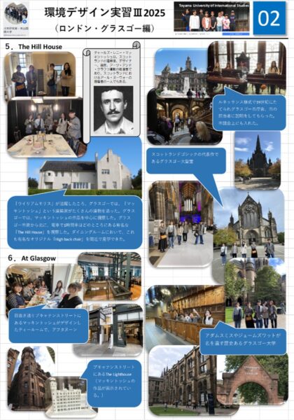 現代社会学部環境デザイン専攻の授業には、「住環境デザインⅠ」「住環境デザインⅡ」「都市空間デザイン」という授業があります。これら住環境系の授業において、建築や住宅の歴史、現代日本の住宅事情と住宅産業の国際比較を学びます。2025年9月16日~9月24日のスケジュールで、「2025年度環境デザイン実習Ⅲ(建築・住宅史海外研修)」が実施され、参加した学生たちは、ロンドン・グラスゴーとその周辺の都市を訪問し、授業で学んだ世界の建築・住宅の歴史、イギリスの住宅事情を実体験してきました。