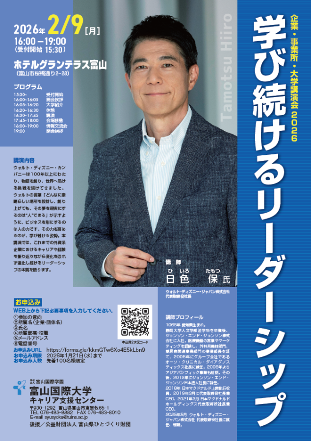2月9日(月)、ホテルグランテラス富山にて「富山国際大学 企業・事業所・大学講演会」を開催いたしました。本講演会は、県内企業・事業所の経営者や人事担当者の皆様を対象に本学が例年開催しているものです。各界の第一線で活躍される方をお招きし、業界の現状や人材育成、事業運営のノウハウについてご講演いただいております。