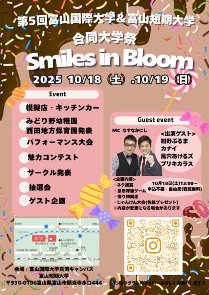 大学祭のテーマには「Smiles in Bloom」を掲げ、来場された皆さまの笑顔であふれる大学祭を目指しています。