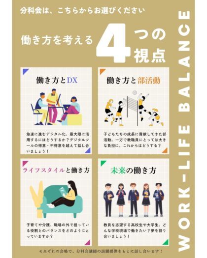 依然として、「教員のなり手不足」が社会問題として横たわる現在、働き方改革に大きな注目が集まっています。子どもたちの学びを確かに保障し、教職員自身が心身ともに健康に働くことができる持続可能な教育・保育の場をどのように創っていくのかは、重要な課題となっています。教員や保育士が生き生きと働ける職場の在り方について、みんなで一緒に考えましょう!