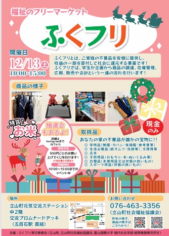 本学の現代社会学部経営情報専攻の学生は、立山町、立山町社会福祉協議会とともに福祉のフリーマーケット(通称:フクフリ)事業を企画、運営しています。この事業では遊休品を安価に提供するとともに、収益の一部を寄付として社会に還元します。学生が商品の調達から在庫管理、チラシの作成、販売や会計という一連の流れに取組み、その販売会を下記のとおり開催いたします。
